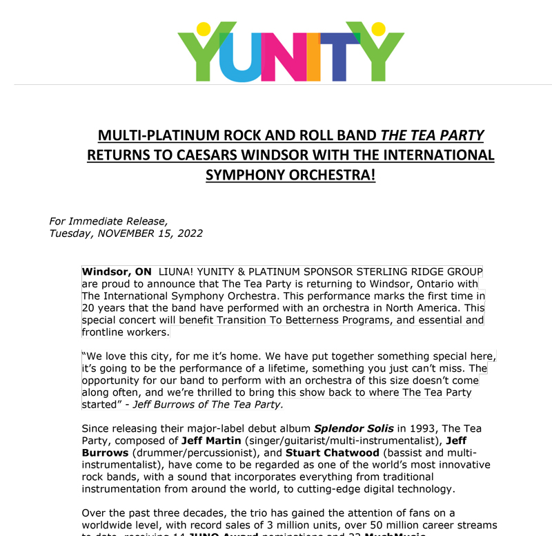 MULTI-PLATINUM ROCK AND ROLL BAND THE TEA PARTY RETURNS TO CAESARS WINDSOR WITH THE INTERNATIONAL SYMPHONY ORCHESTRA! November 15, 2022