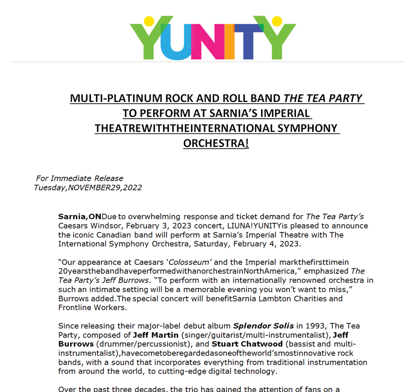 MULTI-PLATINUM ROCK AND ROLL BAND THE TEA PARTY TO PERFORM AT SARNIA’S IMPERIAL THEATRE WITH THE INTERNATIONAL SYMPHONY ORCHESTRA! November 29, 2022